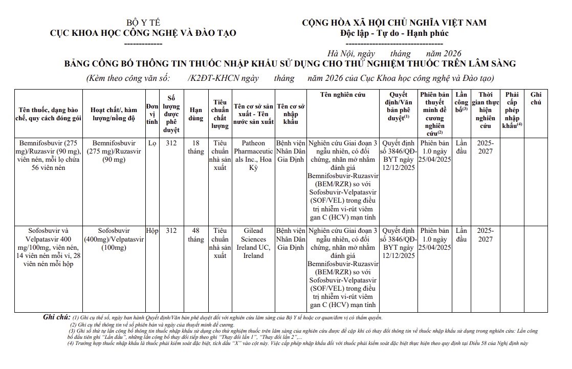 - Thông tin các thuốc nhập khẩu sử dụng cho thử nghiệm thuốc trên lâm sàng (MS: CLEE011A2412B)