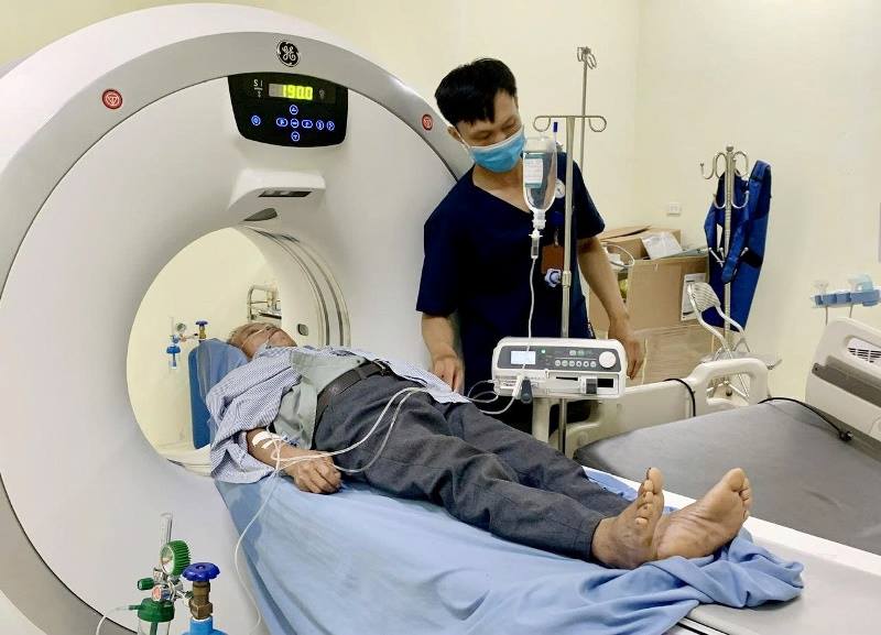 Cán bộ y tế Trung tâm Y tế khu vực Yên Bình thực hiện chụp cắt lớp vi tính (CT) cho người bệnh