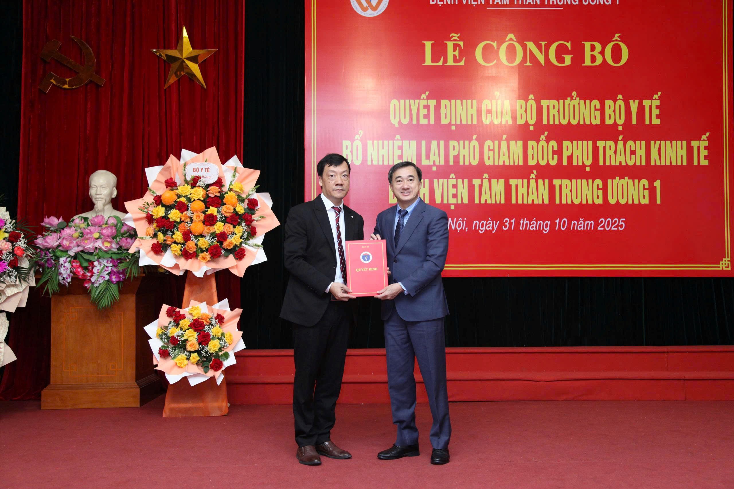 Friday 2025-10-31 01:20Sáng 31/10/2025, Bệnh viện Tâm thần Trung ương 1 tổ chức lễ công bố Quyết định của Bộ trưởng Bộ Y tế về việc bổ nhiệm lại chức vụ Phó Giám đốc phụ trách kinh tế. GS.TS Trần Văn Thuấn, Thứ trưởng...