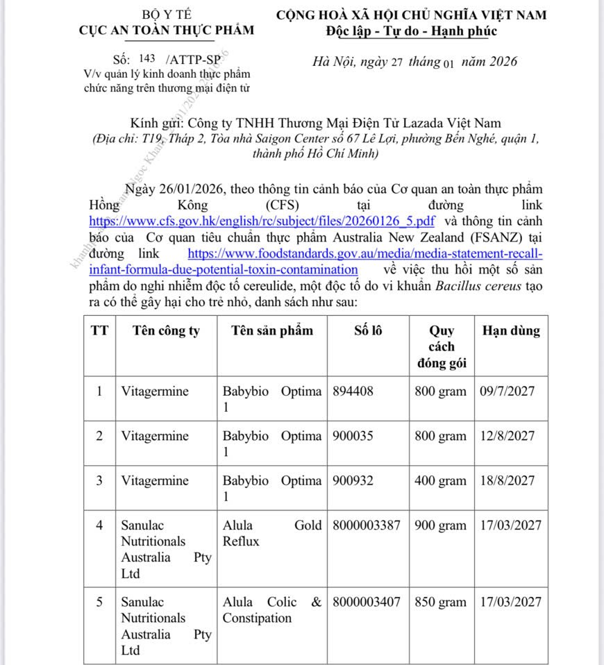 Tuesday 2026-01-27 15:37Cục An toàn thực phẩm - Bộ Y tế tối 27/1/2026 ban hành các Công văn: 143/ATTP-SP, 144/ ATTP-SP, 145/ ATTP-SP gửi: Công ty TNHH Thương Mại Điện Tử Lazada Việt Nam; Công ty TNHH Shopee; Công...