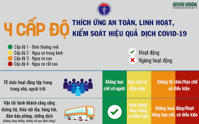 Theo Nghị quyết 128 của Chính phủ, 4 cấp độ dịch gồm cấp 1 (nguy cơ thấp - bình thường mới) màu xanh; cấp 2 (nguy cơ trung bình) màu vàng; cấp 3 (nguy cơ cao) màu cam, cấp 4 (nguy cơ rất cao) màu đỏ được phân chia dựa theo số lượng ca mắc và số người đã được tiêm vaccine.
