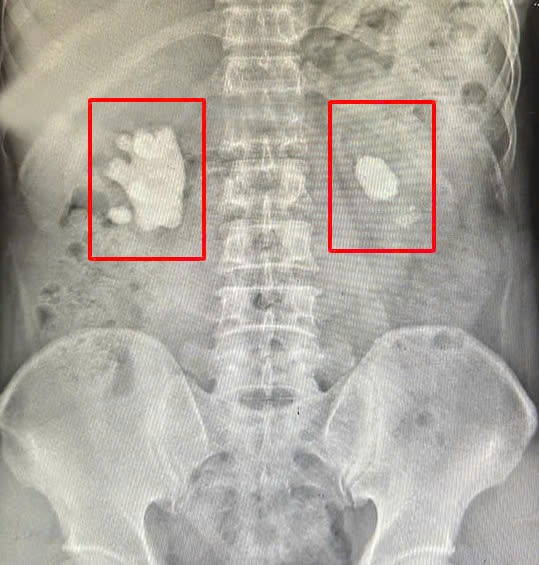 Sau khi nhập viện, người bệnh được thăm khám và chụp Xquang, cắt lớp vi tính. Kết quả chụp cho thấy, ông Đ. có sỏi thận 2 bên, khối sỏi lớn hình dạng giống san hô chiếm gần hết bể thận.
