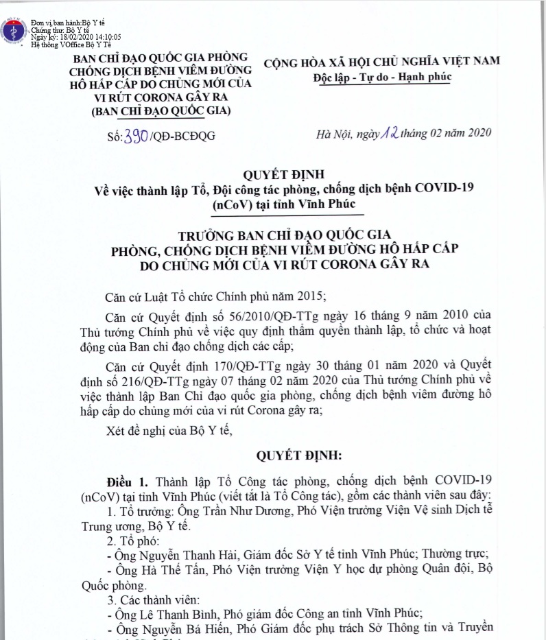 Wednesday 2020-02-12 04:05Công văn 390/QĐ-BCĐQG về việc thành lập Tổ, Đội công tác phòng, chống dịch bệnh Covid-19 tại Vĩnh Phúc Thông tin chi tiết xem tại đây