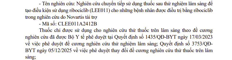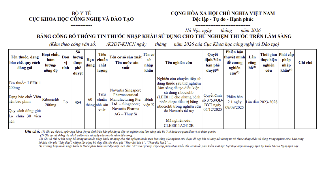 Thông tin các thuốc nhập khẩu sử dụng cho thử nghiệm thuốc trên lâm sàng (MS: CLEE011A2412B)