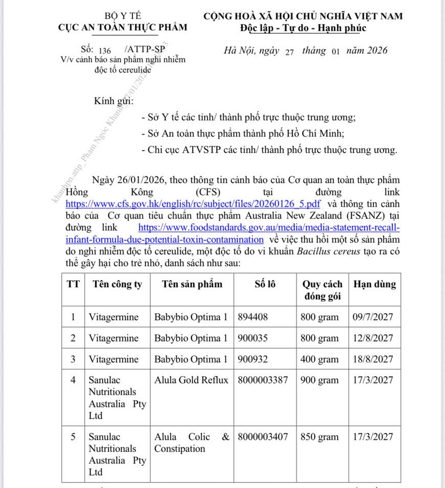 Tuesday 2026-01-27 12:33Ngày 27/01/2026, TS Chu Quốc Thịnh, Quyền Cục trưởng Cục An toàn thực phẩm (Bộ Y tế) ban hành Công văn số 136/ATTP-SP về việc cảnh báo sản phẩm nghi nhiễm độc tố cereulide và các Công văn...