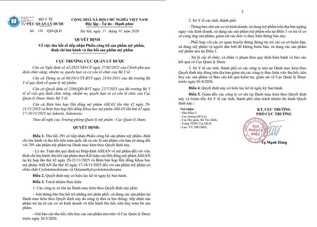 Tuesday 2026-03-03 01:04Cục Quản lý Dược, Bộ Y tế vừa ra Quyết định thu hồi phiếu tiếp nhận công bố mỹ phẩm, đình chỉ lưu hành và thu hồi sản phẩm đối với 291 mỹ phẩm có chứa chứa Cyclotetrasiloxane và...