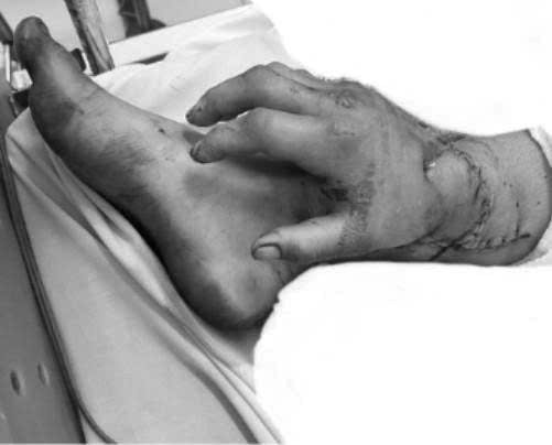 Bàn tay đứt lìa được ghép tạm vào chân bệnh nhân thời điểm trước đó. Ảnh: BVCC