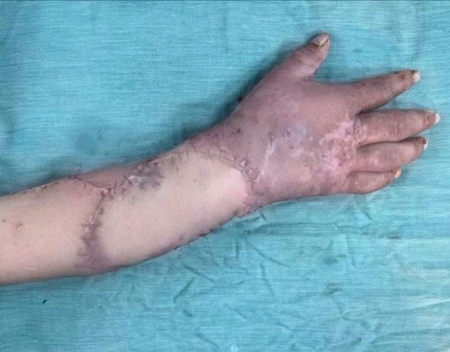 Xương quay được nối bằng nẹp vít, một động mạch và ba tĩnh mạch nuôi bàn tay được nối lại, gân và thần kinh được ghép từ các vị trí thích hợp. Khuyết da được che phủ bằng các đảo da lấy từ bụng, bẹn và vùng cẳng chân.