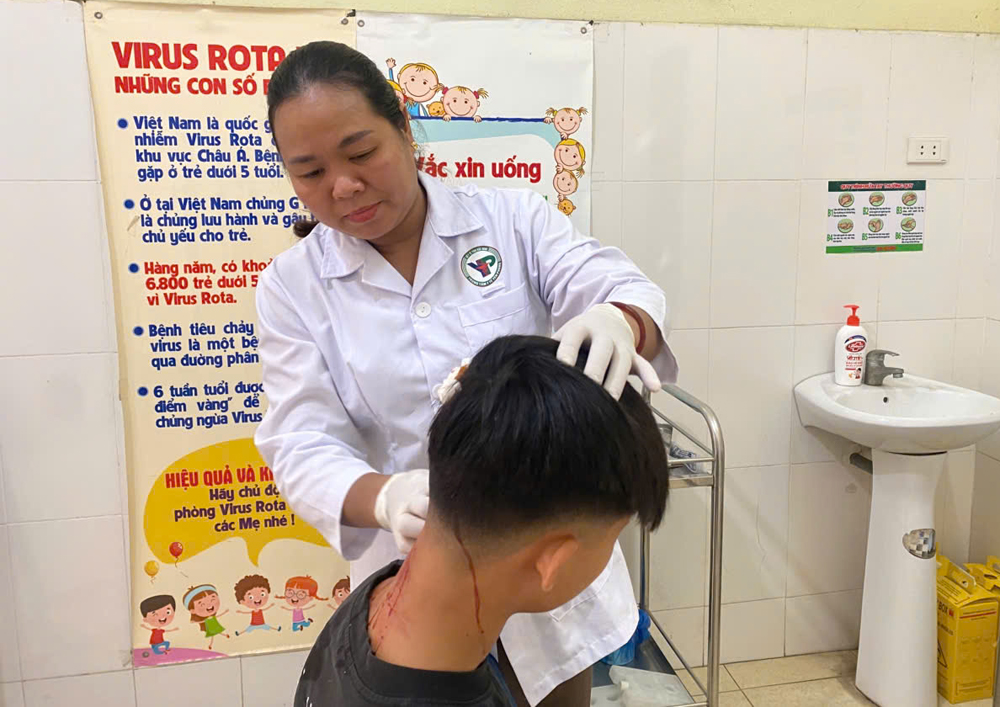 Cán bộ Trạm Y tế Hòa Tiến, xã Tam Giang sơ cứu cho học sinh bị ngã do trơn trượt. |