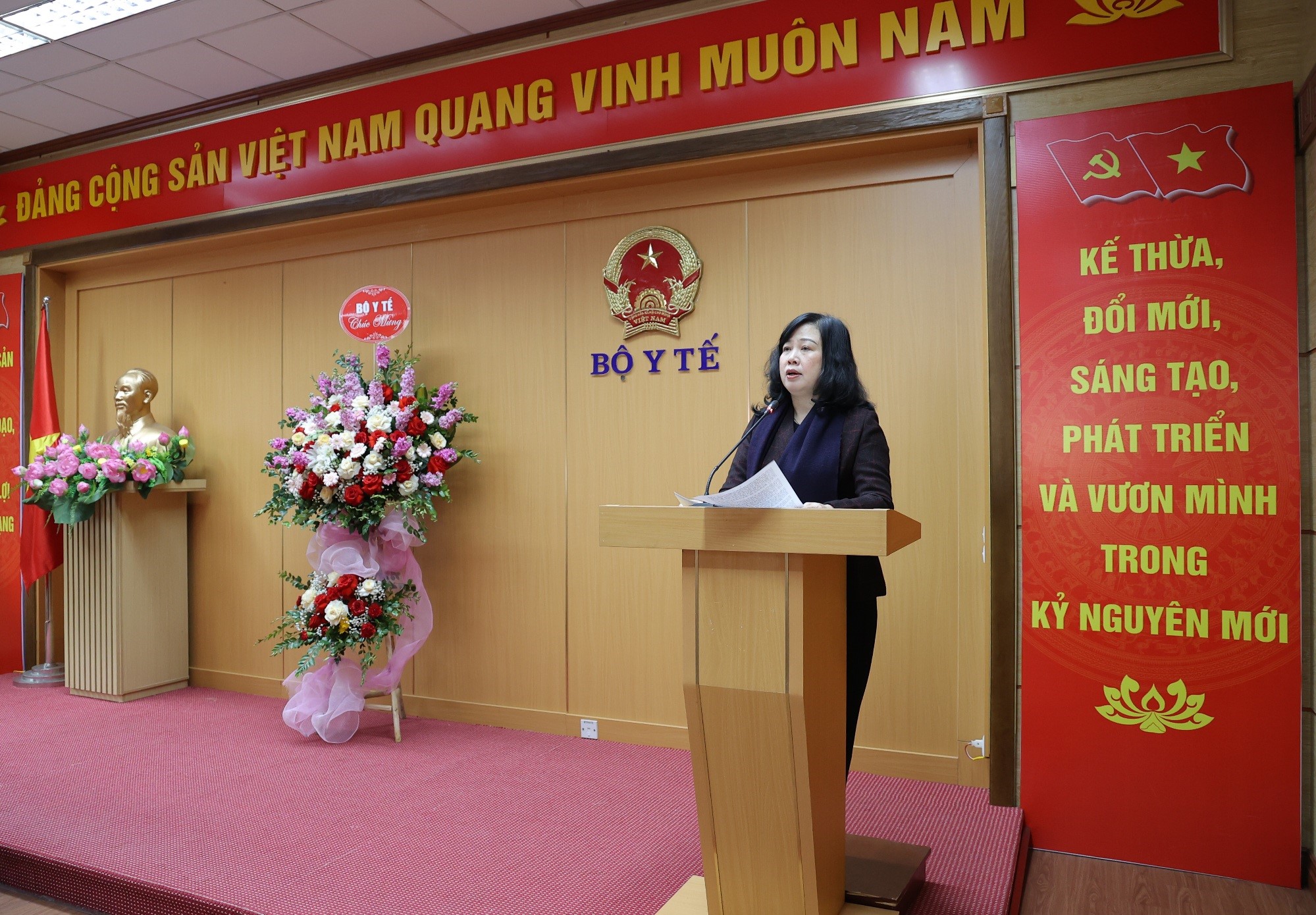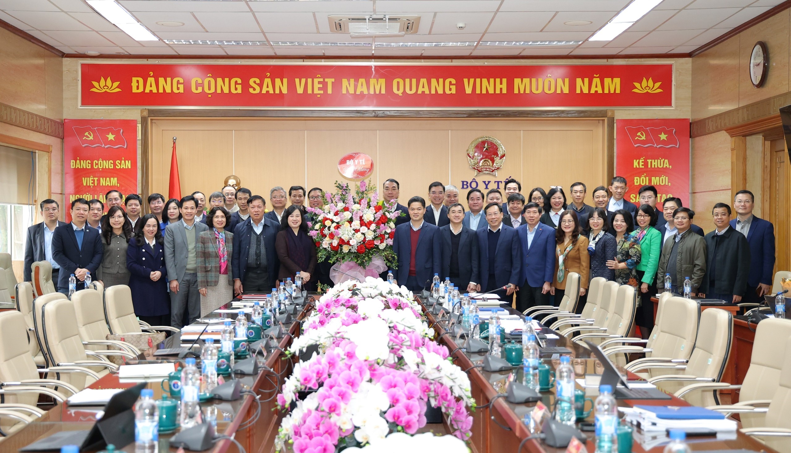 Tập thể cán bộ lãnh đạo Đảng ủy, lãnh đạo các đơn vị của Bộ Y tế tặng hoa chúc mừng Bộ trưởng Bộ Y tế Đào Hồng Lan và Thứ trưởng Thường trực Bộ Y tế Vũ Mạnh Hà