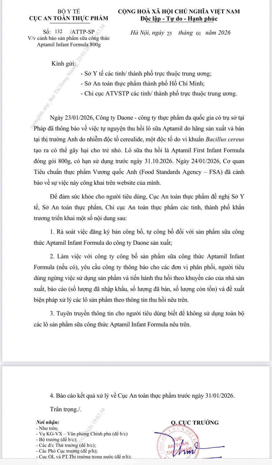 Chủ Nhật, ngày 25/01/2026 15:46Ngày 23/01/2026, Công ty Danone - công ty thực phẩm đa quốc gia có trụ sở tại Pháp đã thông báo về việc tự nguyện thu hồi lô sữa Aptamil do hãng sản xuất và bán tại thị trường Anh do nhiễm...