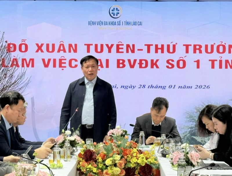 Ngày 28/01/2026, Đoàn công tác của Bộ Y tế do Thứ trưởng Bộ Y tế Đỗ Xuân Tuyên làm trưởng đoàn làm việc với tỉnh Lào Cai về tình hình triển khai thực hiện Nghị quyết số 72-NQ/TW ngày 09/9/2025 của Bộ Chính trị về một số giải pháp đột phá nhằm tăng cường bảo vệ, chăm sóc và nâng cao sức khỏe Nhân dân; đồng thời đánh giá kết quả thực hiện công tác dân số năm 2025 trên địa bàn tỉnh.