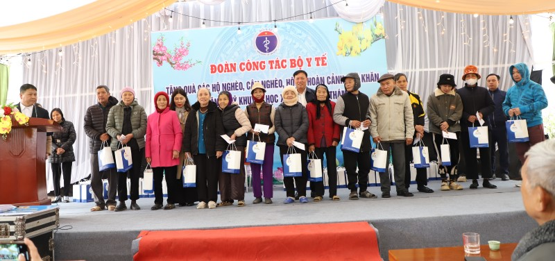 Thứ trưởng Bộ Y tế Đỗ Xuân Tuyên và đoàn công tác trao biểu trưng tặng quà Tết cho các hộ có hoàn cảnh khó khăn tại xã Hoàng Hoa Thám.