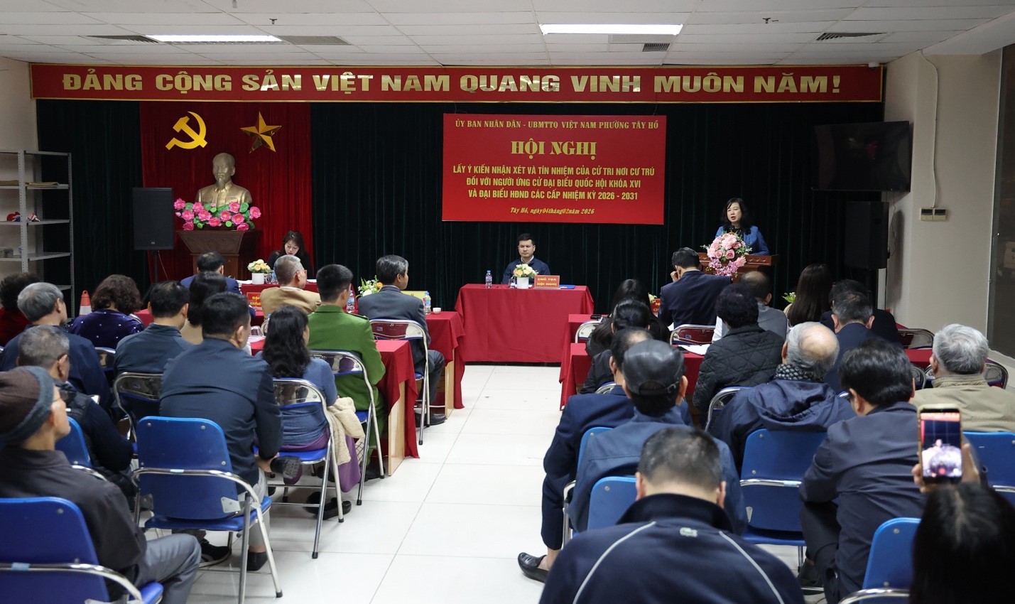 Thứ Năm, ngày 05/02/2026 08:33Tại hội nghị lấy ý kiến nhận xét và tín nhiệm của cử tri nơi cư trú đối với người ứng cử Đại biểu Quốc hội, 100% cử tri nơi cư trú biểu quyết nhất trí giới thiệu Ủy viên Ban Chấp hành Trung...
