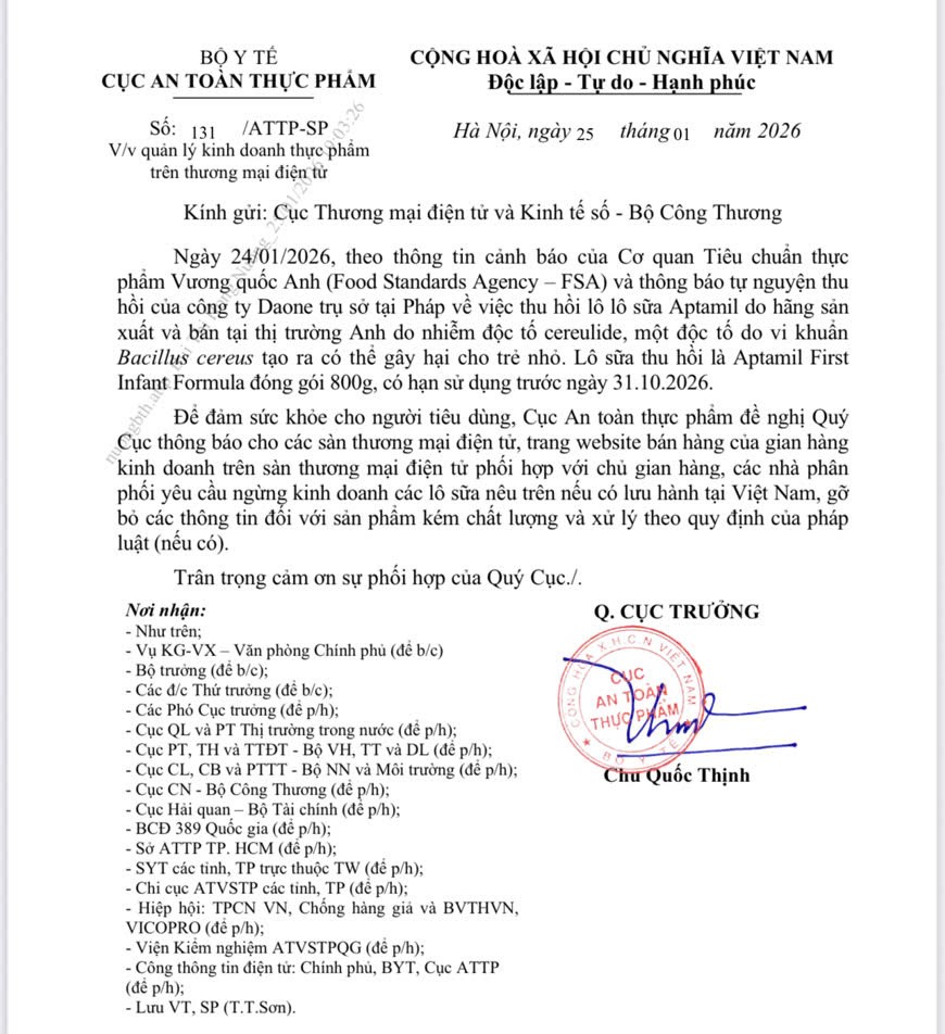 Ngày 25/01/2026, TS Chu Quốc Thịnh, Quyền Cục trưởng Cục An toàn thực phẩm (Bộ Y tế) ban hành Công văn số 132/ATTP-SP gửi Sở Y tế các tỉnh/ thành phố trực thuộc trung ương; Sở An toàn thực phẩm thành phố Hồ Chí Minh; Chi cục ATVSTP các tỉnh/ thành phố trực thuộc trung ương về việc cảnh báo sản phẩm sữa công thức Aptamil Infant Formula 800g.
