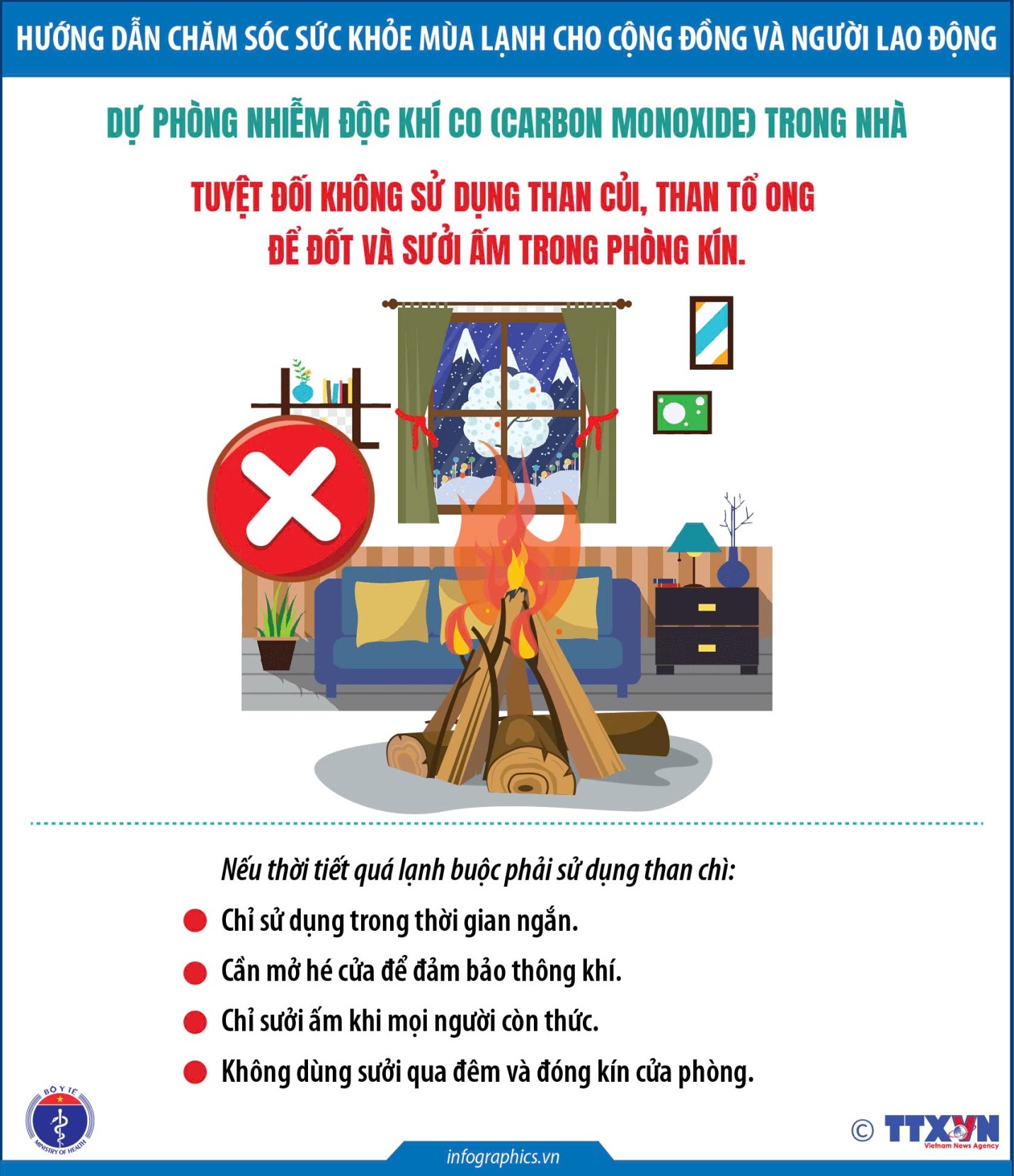 Đặc biệt, trong bối cảnh nhiều gia đình sử dụng các biện pháp sưởi ấm như than tổ ong, bếp than, bếp củi, Bộ Y tế khuyến cáo tuyệt đối không đốt than trong phòng kín, phòng không thông gió. Khí CO sinh ra khi đốt có thể gây ngộ độc, lơ mơ, hôn mê và tử vong nhanh chóng.