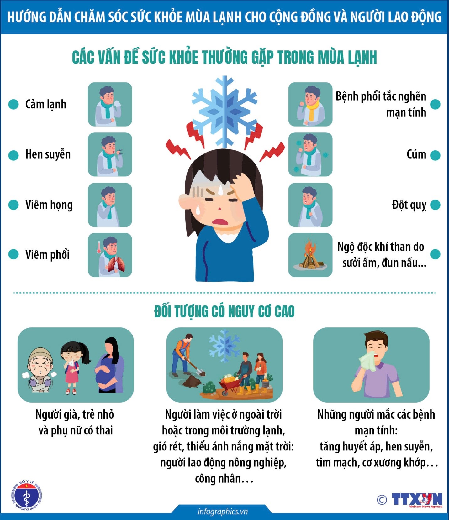 Theo các chuyên gia y tế, trong mùa lạnh, cộng đồng thường gặp nhiều bệnh lý phổ biến như cảm lạnh, hen suyễn, viêm họng, viêm phổi, cúm, bệnh phổi tắc nghẽn mạn tính. Một số trường hợp có thể diễn tiến nặng, gây biến chứng nguy hiểm như đột quỵ - vốn có liên quan đến sự thay đổi nhiệt độ đột ngột, co mạch, tăng huyết áp. Ngoài ra, đáng chú ý mỗi năm đều ghi nhận các ca ngộ độc khí than do sưởi ấm hoặc đun nấu trong phòng kín, tiềm ẩn nguy cơ tử vong nếu không được phát hiện sớm.