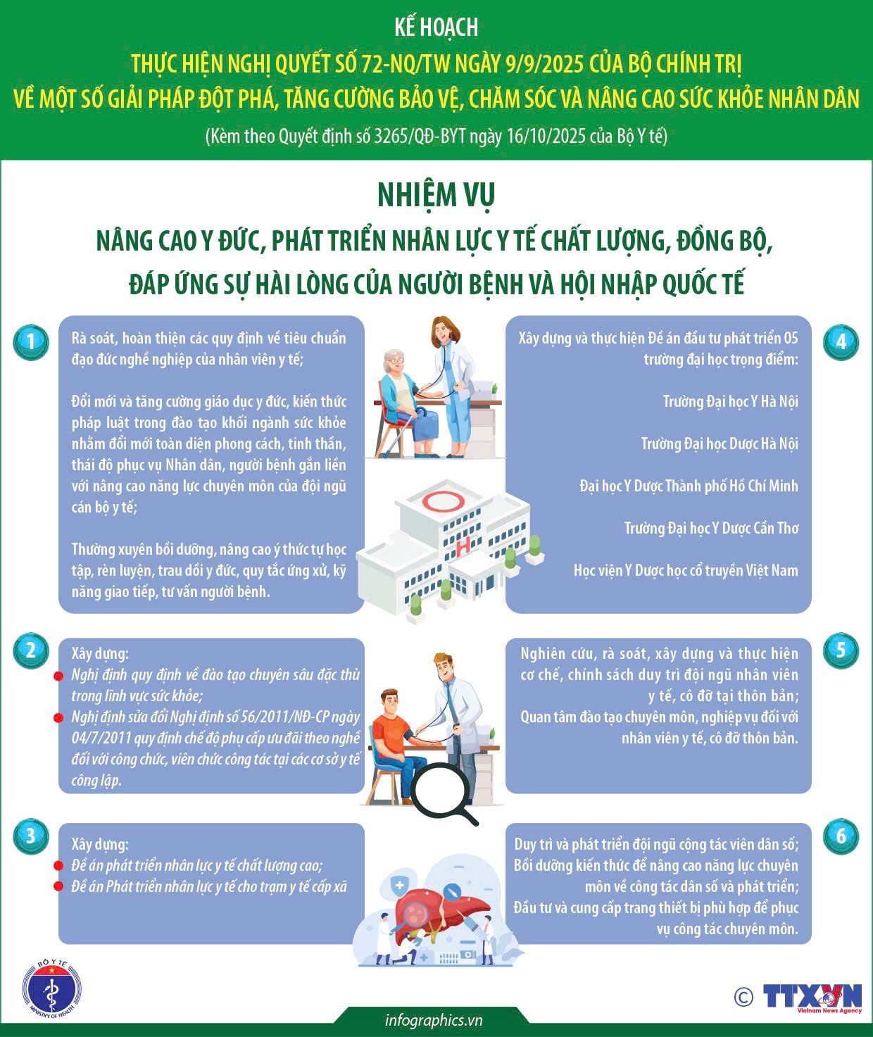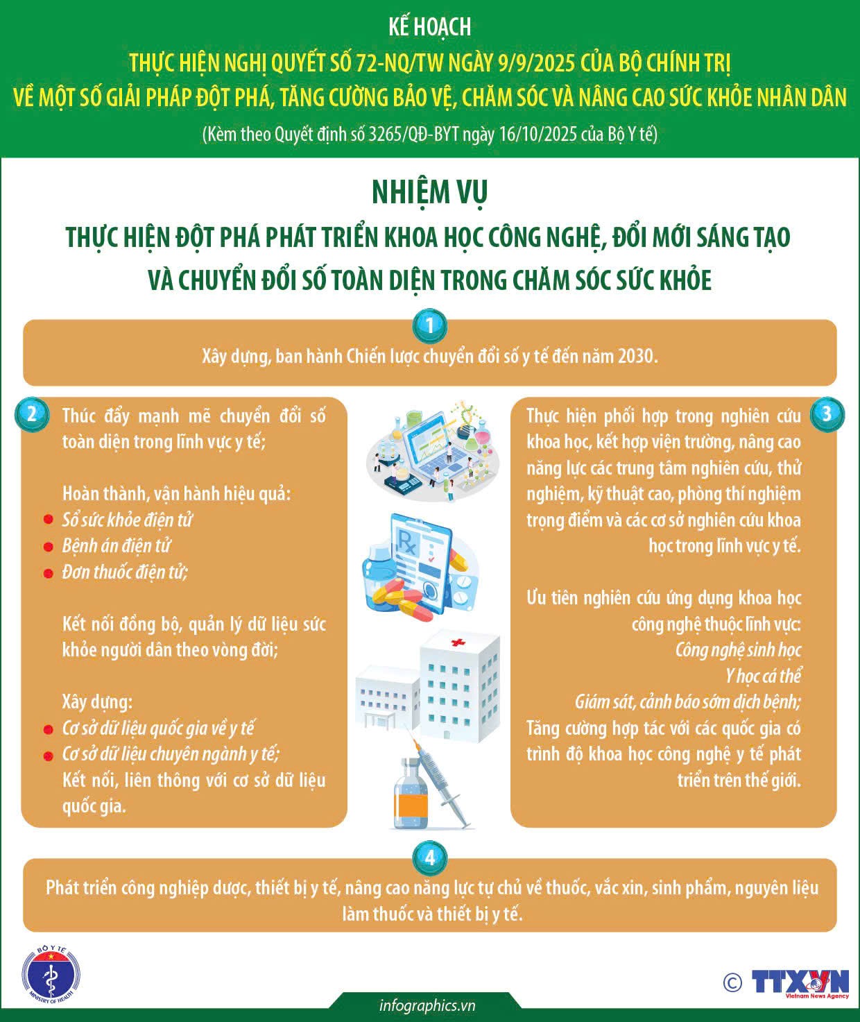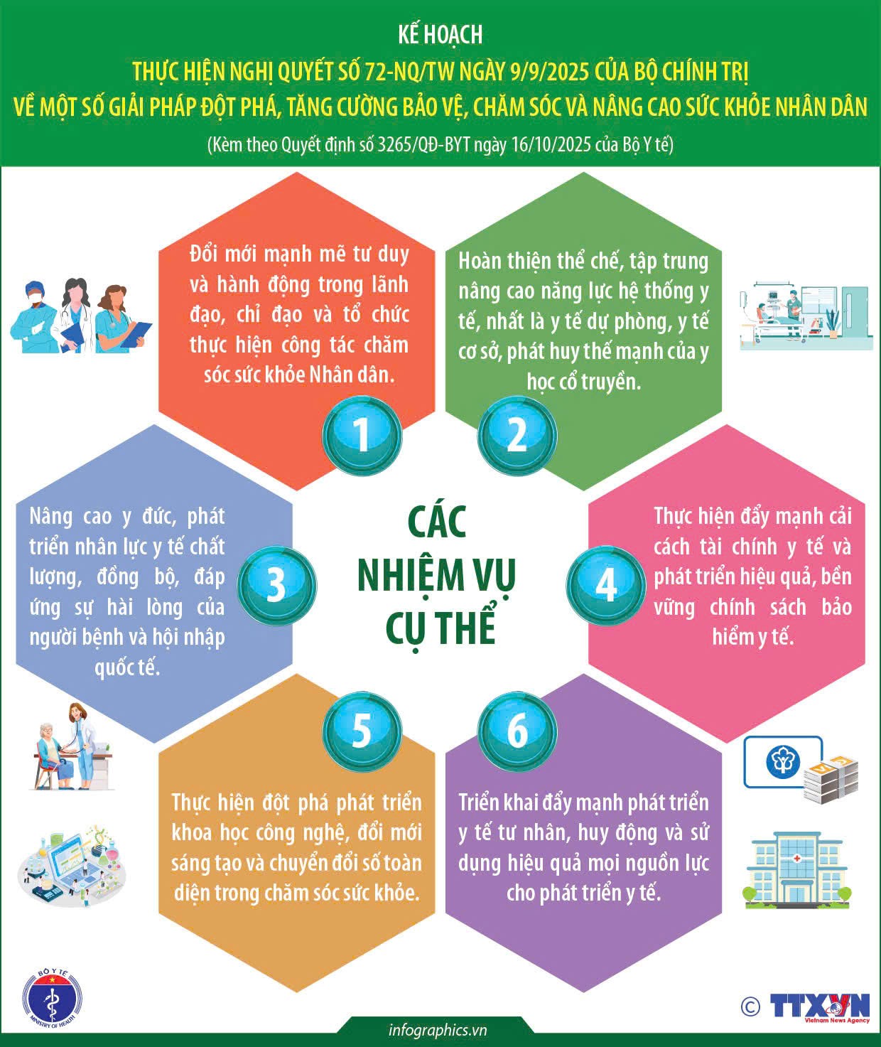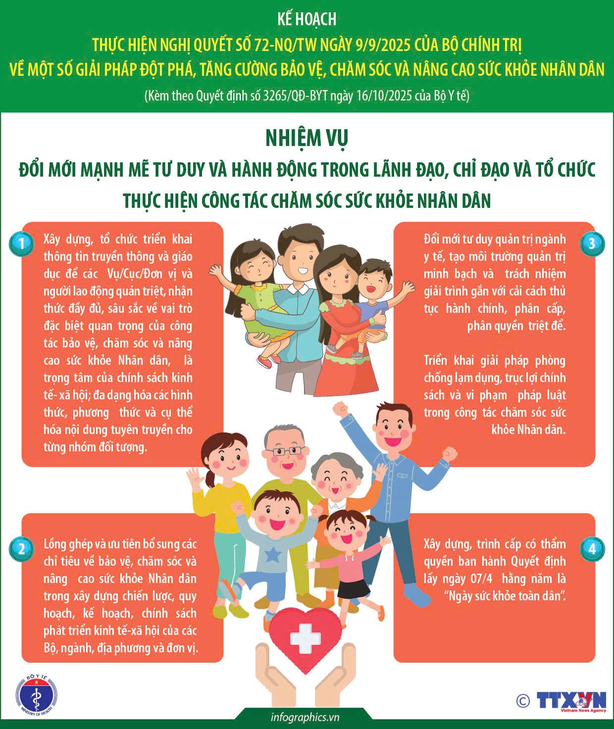 Ngày 16/10/2025, Bộ Y tế ban hành Quyết định 3265/QĐ-BYT, phê duyệt Kế hoạch triển khai Nghị quyết số 72-NQ/TW của Bộ Chính trị về những giải pháp đột phá nhằm tăng cường bảo vệ, chăm sóc và nâng cao sức khỏe nhân dân. Văn bản xác định rõ mục tiêu, nhiệm vụ, lộ trình và trách nhiệm của các đơn vị trong toàn ngành, tạo nền tảng để đưa Nghị quyết đi vào thực tiễn một cách hiệu quả, thống nhất và đồng bộ.