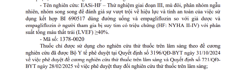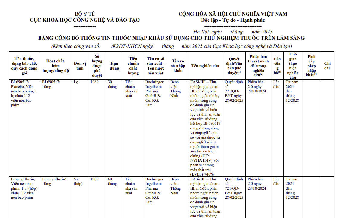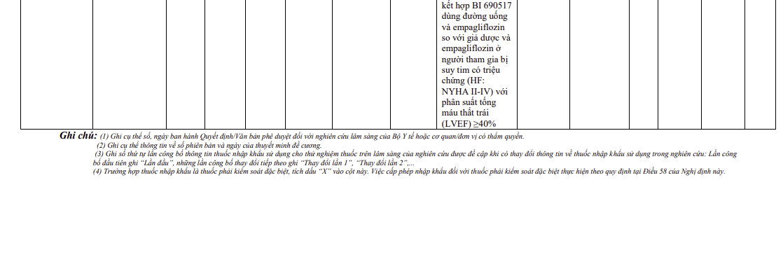 Thông tin các thuốc nhập khẩu sử dụng cho thử nghiệm thuốc trên lâm sàng (Mã số: 1378-0020)