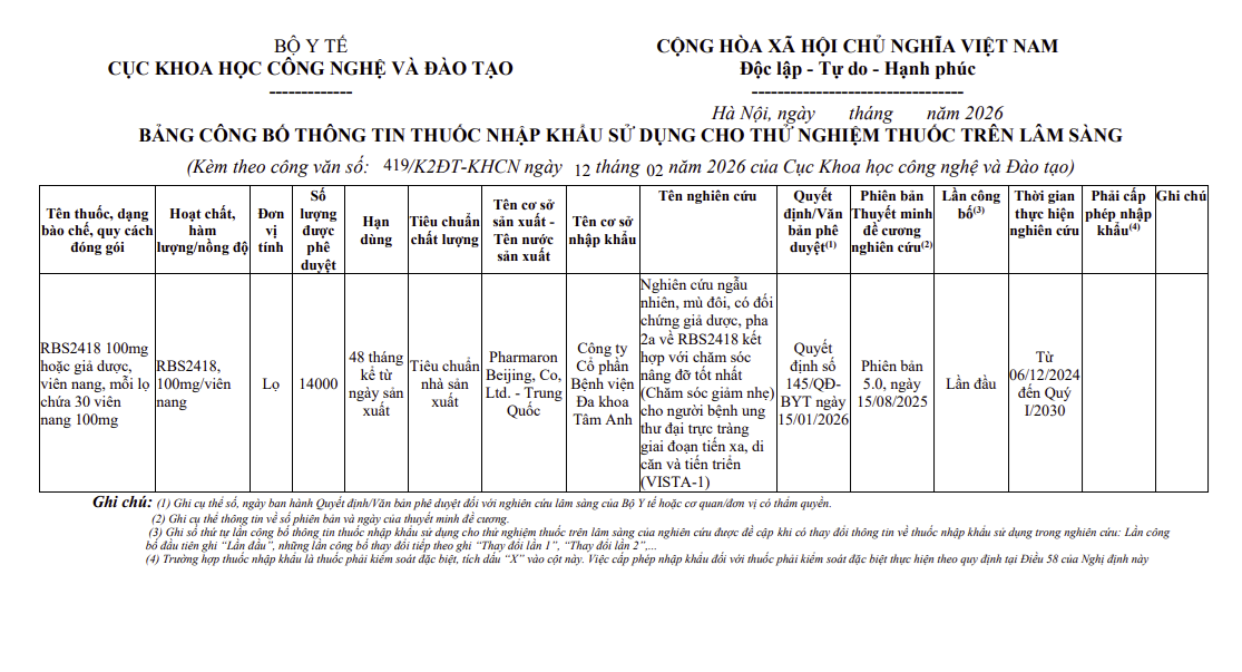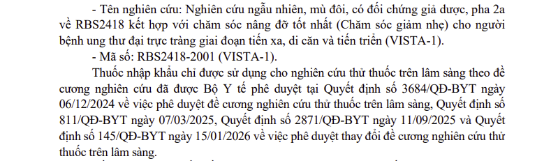 Thông tin các thuốc nhập khẩu sử dụng cho thử nghiệm thuốc trên lâm sàng (MS: RBS2418-2001 (VISTA-1))
