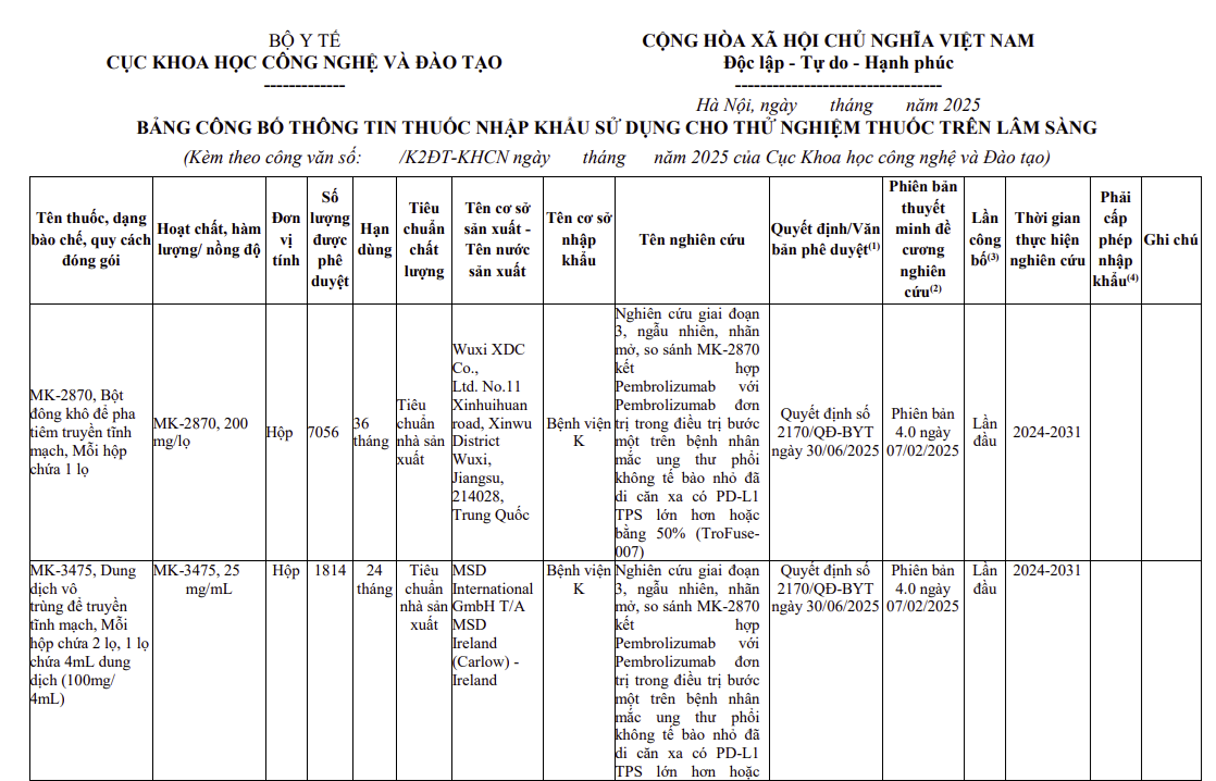 Thông tin thuốc nhập khẩu sử dụng cho thử nghiệm thuốc trên lâm sàng, mã số: MK-2870-007