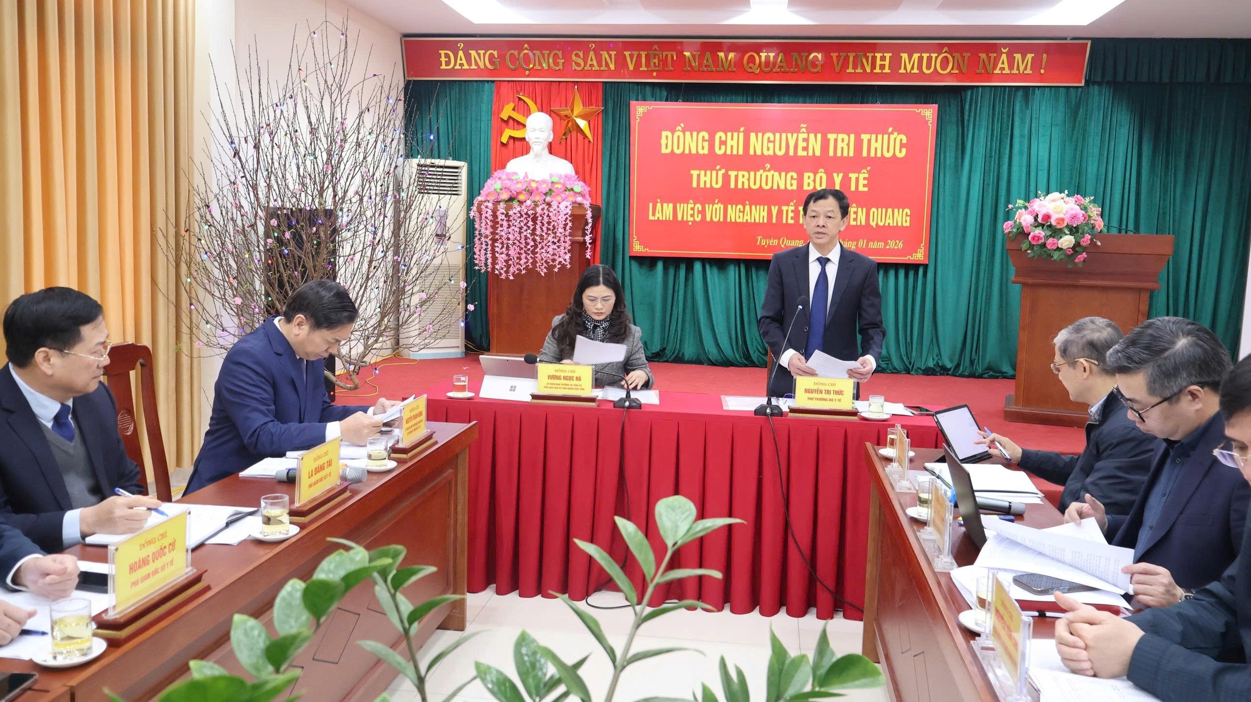 Ngày 26/01/2026, Đoàn công tác của Bộ Y tế do PGS.TS.BSCKII Nguyễn Tri Thức, Thứ trưởng Bộ Y tế làm Trưởng đoàn đã có buổi làm việc với ngành Y tế tỉnh Tuyên Quang. Tham gia đoàn có Lãnh đạo các Cục: Khoa học Công nghệ và Đào tạo, Bà mẹ - Trẻ em; Các Vụ: Tổ chức cán bộ, Kế hoạch - Tài chính, Viện Chiến lược và Chính sách y tế, Quỹ Bảo trợ trẻ em Việt Nam, Trung tâm Thông tin y tế Quốc gia.