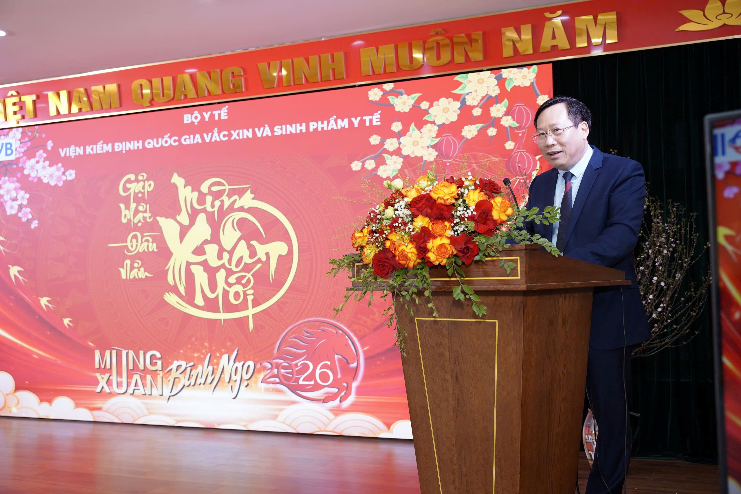 Phát biểu tại đây, Thứ trưởng Bộ Y tế Lê Đức Luận gửi lời chúc mừng năm mới, đánh giá cao và ghi nhận những kết quả Viện Kiểm định Quốc gia Vắc xin và Sinh phẩm y tế đã đạt được thời gian qua, cũng như đảm bảo công tác chuyên môn, an ninh an toàn trong dịp Tết và quyết tâm bắt tay ngay vào việc chuyên môn, nhiệm vụ trọng tâm năm 2026 của Viện.