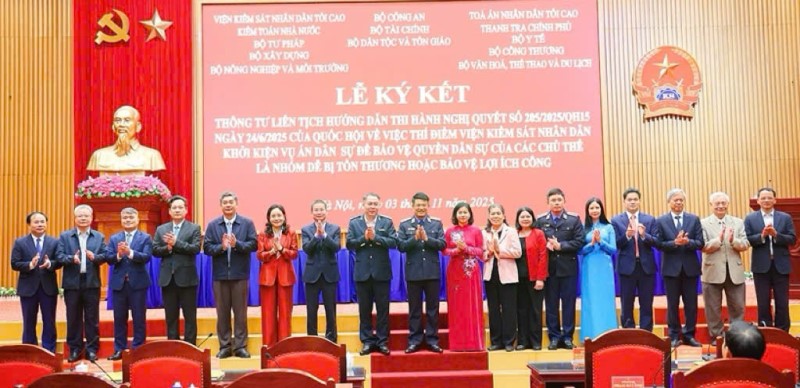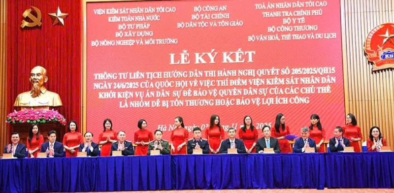 Chiều 03/11/2025, tại Hà Nội, Viện Kiểm sát Nhân dân (KSND) tối cao chủ trì tổ chức Lễ ký Thông tư liên tịch hướng dẫn thi hành Nghị quyết số 205/2025/QH15 ngày 24/6/2025 của Quốc hội về việc thí điểm VKSND khởi kiện vụ án dân sự để bảo vệ quyền dân sự của các chủ thể là nhóm dễ bị tổn thương hoặc bảo vệ lợi ích công.