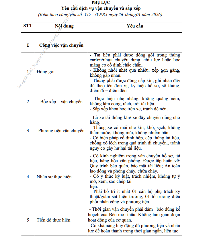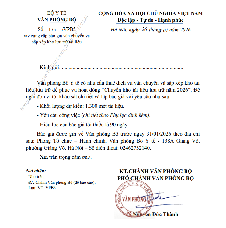 Văn phòng Bộ mời cung cấp báo giá vận chuyển và sắp xếp kho lưu trữ tài liệu