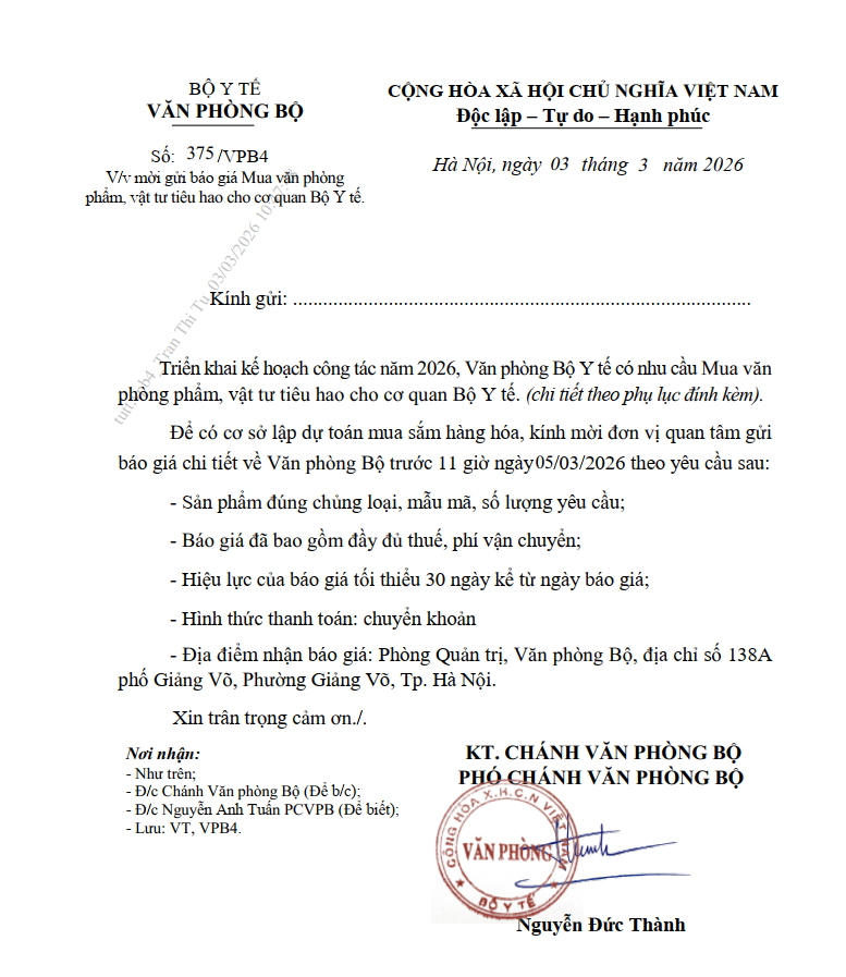 Văn phòng Bộ mời gửi báo giá mua văn phòng phẩm, vật tư tiêu hao cho cơ quan Bộ Y tế