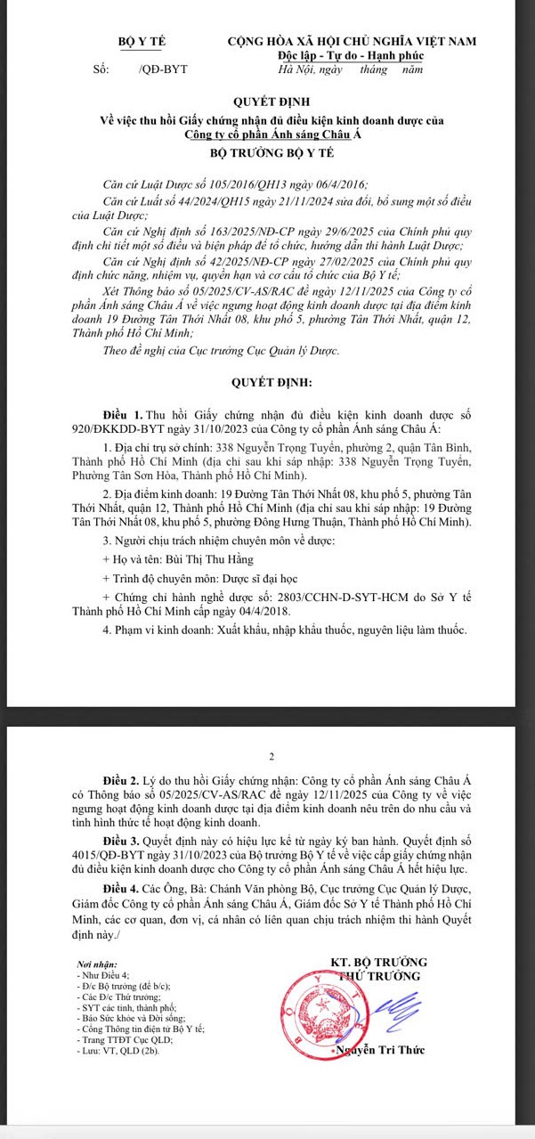 Bộ Y tế: Thu hồi Giấy chứng nhận đủ điều kiện kinh doanh dược của Công ty cổ phần Ánh sáng Châu Á