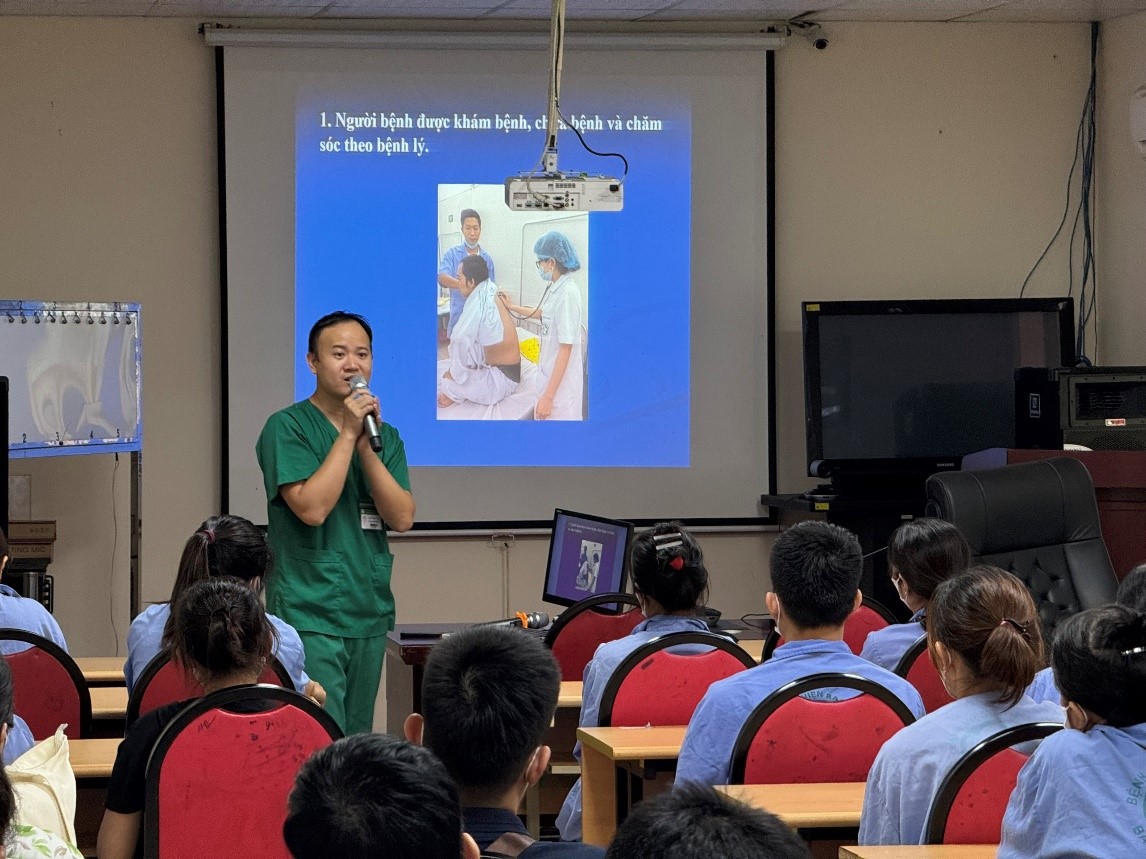 Mở đầu chương trình, CN ĐD Nguyễn Văn Luân - Trung tâm Bệnh nhiệt đới đã giới thiệu về quyền lợi của NB được hưởng trong quá trình điều trị: NB được khám bệnh, chữa bệnh và chăm sóc theo bệnh lý; NB được phục vụ ăn uống theo chế độ ăn uống bệnh lý. Nước sôi được phục vụ miễn phí tại các cây nước công nghiệp đặt 2 đầu hành lang; NB được sử dụng quần áo, chăn, ga và dụng cụ sinh hoạt của Bệnh viện quy định; NB và NNNB được thầy thuốc giải thích về tình trạng bệnh tật, công khai thuốc được sử dụng, cách ăn uống, sinh hoạt, nghỉ ngơi và tự bảo vệ sức khỏe; NB và NNNB được góp ý xây dựng về tinh thần trách nhiệm, thái độ phục vụ của các nhân viên y tế trong bệnh viện bằng cách Quét mã QR để đánh giá online.