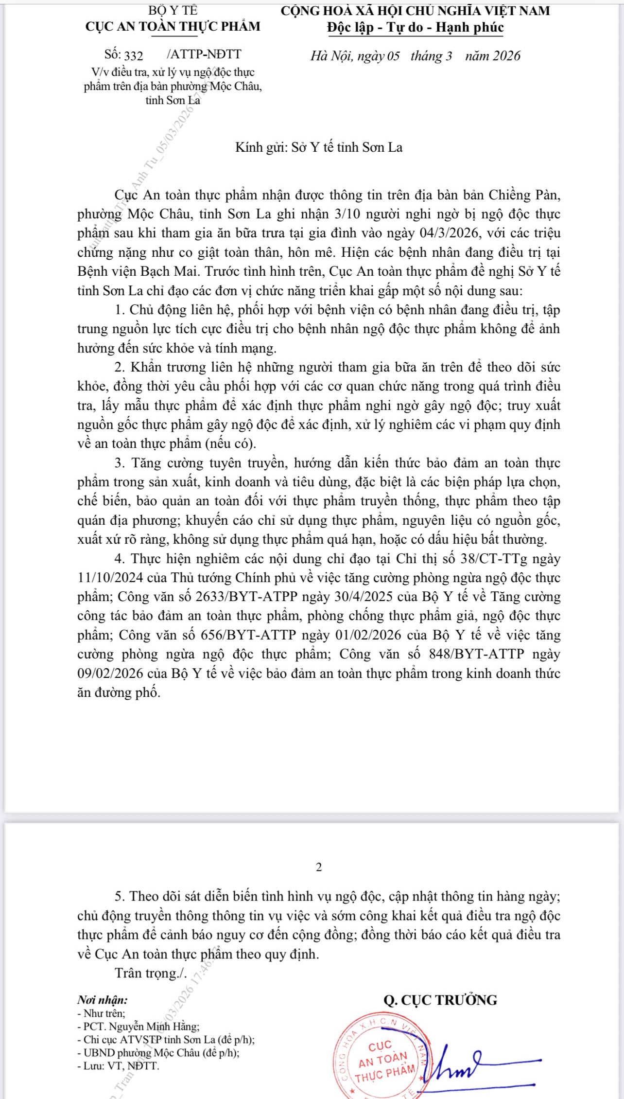 Thứ Năm, ngày 05/03/2026 11:42Ngày 05/3/2026, TS Chu Quốc Thịnh, Quyền Cục trưởng Cục An toàn thực phẩm (Bộ Y tế) ban hành Công văn số 332/ATTP-NĐTP gửi Sở Y tế tỉnh Sơn La yêu cầu khẩn trương điều tra, xử lý vụ ngộ độc thực...