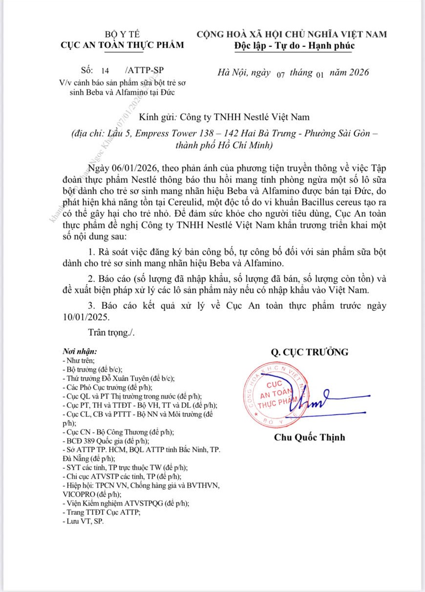 Thứ Ba, ngày 13/01/2026 15:13Ngày 13/01/2026, TS Chu Quốc Thịnh, Quyền Cục trưởng Cục An toàn thực phẩm (Bộ Y tế) có Công văn số 58/ATTP-NĐTP đề nghị Sở An toàn thực phẩm TP.Hồ Chí Minh khẩn trương kiểm tra, xác...
