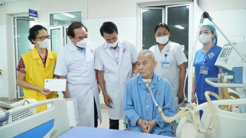 PGS.TS Nguyễn Công Hoàng - Giám đốc Bệnh viện Trung ương Thái Nguyên (thứ 2 từ trái sang) thăm hỏi, tặng quà cho người bệnh đang điều trị tại khoa Hồi sức tích cực – Chống độc phải điều trị. Ảnh: Bệnh viện cung cấp.