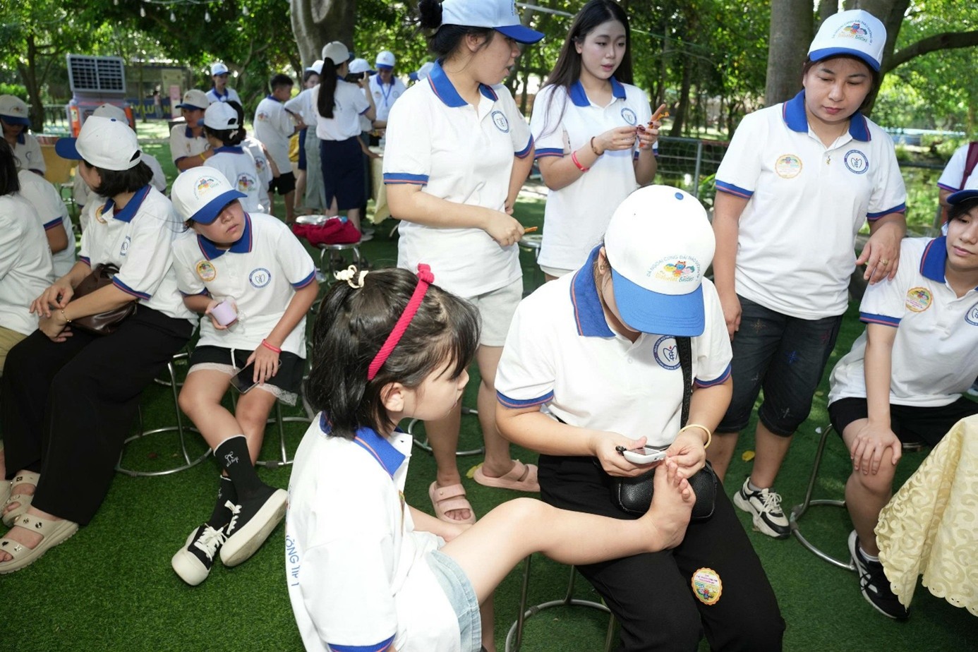 Trẻ được đo đường huyết khi tham gia dã ngoại tại chương trình.