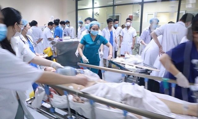 Y bác sĩ, nhân viên y tế Bệnh viện E tất bật cứu chữa nạn nhân của một vụ tai nạn giao thông.
