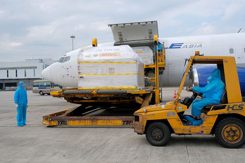 Vận chuyển vắc xin Pfizer từ máy bay xuống để đưa về bảo quản tại kho lạnh Ảnh:Trần Minh