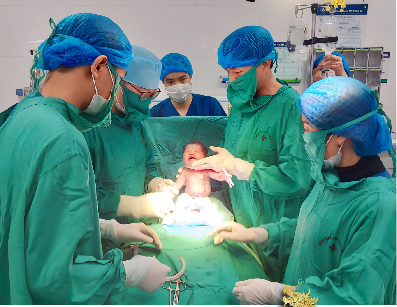 Vào thời khắc Giao thừa Tết Giáp Thìn, tiếng oe oe của 'chú rồng nhỏ' N.C.H.V. vang lên trong phòng mổ của Bệnh viện Phụ sản Trung ương. Cu cậu khóc to, nặng 3,2 kg. Ngay sau đó, tại phòng mổ, các y bác sĩ lần lượt đón 2 bé gái song sinh chào đời...