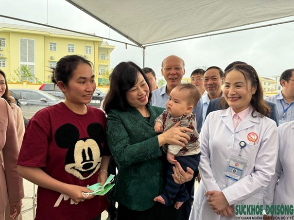 Bộ trưởng Bộ Y tế Đào Hồng Lan bế trẻ đến chờ tiêm vaccine phòng bệnh sởi tại tỉnh Quảng Ninh hồi tháng 3/2025. Ảnh: Thái Bình