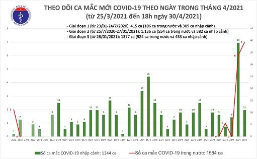 - Tính từ 6h đến 18h ngày 30/4: 14 ca mắc mới, trong đó có 10 ca được cách ly ngay sau khi nhập cảnh.