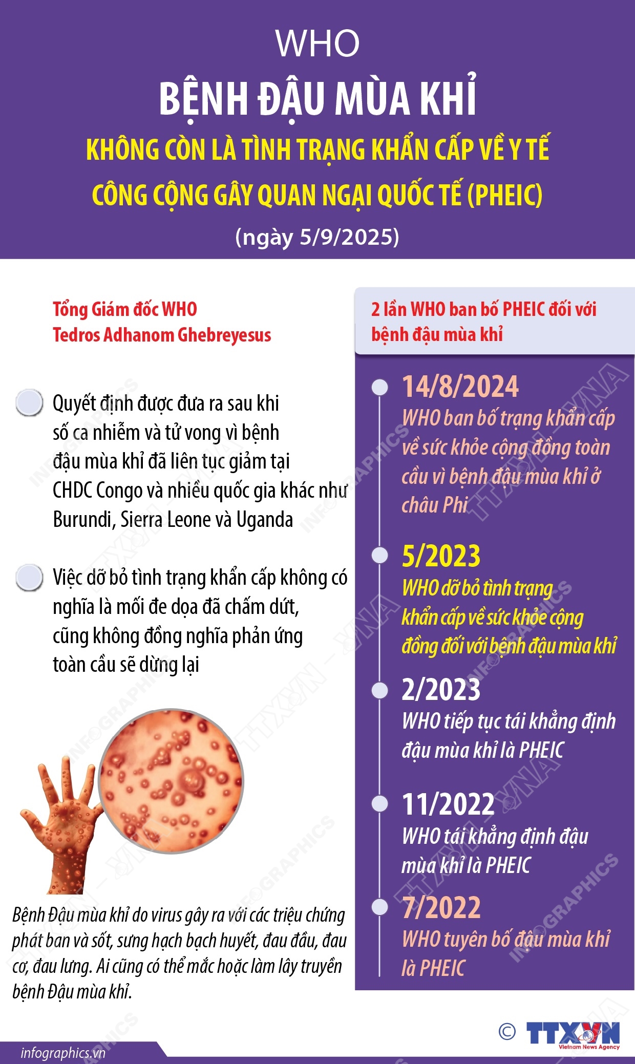 Tổ chức Y tế Thế giới (WHO) ngày 5/9/2025 tuyên bố bệnh đậu mùa khỉ (Mpox) không còn được xem là tình trạng khẩn cấp y tế công cộng gây quan ngại quốc tế (PHEIC), mức cảnh báo cao nhất của cơ quan này.
