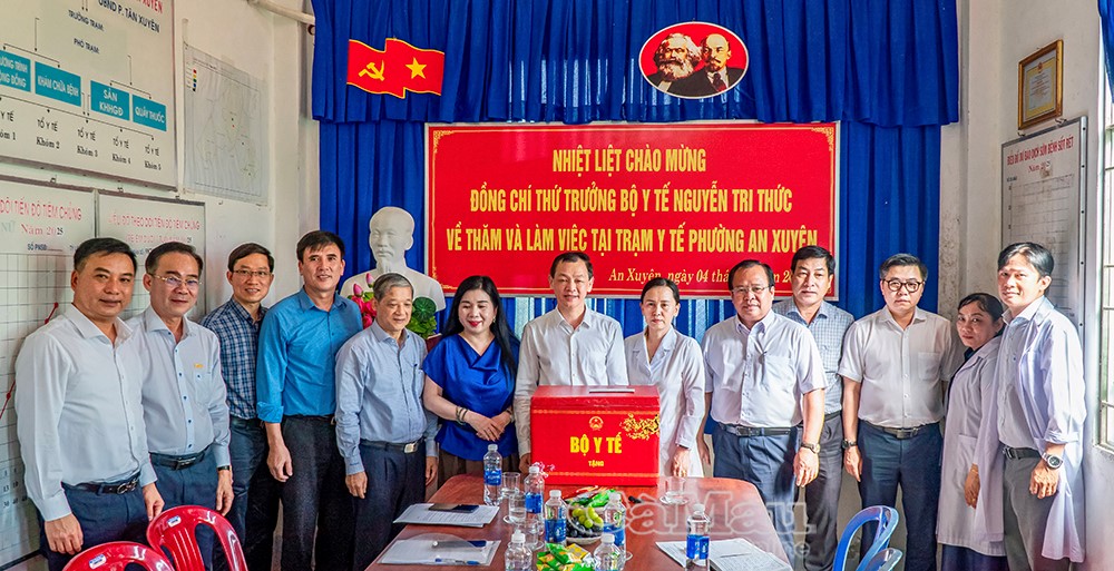 Theo chương trình làm việc, đoàn công tác thăm, làm việc tại Trạm Y tế phường An Xuyên. Tại đây, Thứ trưởng Bộ Y tế Nguyễn Tri Thức tham quan cơ sở vật chất, nghe báo cáo ngắn về tình hình nhân lực, thuốc, vật tư, công tác y tế dự phòng, quản lý bệnh không lây nhiễm, những khó khăn sau sắp xếp đơn vị hành chính và các đề xuất, kiến nghị của địa phương. Thay mặt lãnh đạo Bộ Y tế, Thứ trưởng Nguyễn Tri Thức  trao tặng Trạm Y tế phường An Xuyên một số trang thiết bị y tế phục vụ khám, chữa bệnh và 70 phần quà (mỗi phần trị giá 01 triệu đồng) cho học sinh có hoàn cảnh khó khăn trên địa bàn..