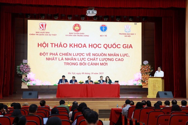 Sáng 08/10/2025, tại Hà Nội, Nhà Xuất bản Chính trị quốc gia Sự thật phối hợp với Ban Tuyên giáo và Dân vận Trung ương, Bộ Y tế, Trường Đại học Y Hà Nội tổ chức hội thảo khoa học quốc gia “Đột phá chiến lược về nguồn nhân lực, nhất là nhân lực chất lượng cao trong bối cảnh mới”. GS.TS Phùng Hữu Phú, nguyên Ủy viên Trung ương Đảng, nguyên Phó Trưởng Ban Thường trực Ban Tuyên giáo Trung ương; TS. Vũ Thanh Mai, Phó Trưởng Ban Tuyên giáo và Dân vận Trung ương; PGS.TS Vũ Trọng Lâm, Giám đốc, Tổng Biên tập Nhà xuất bản Chính trị Quốc gia Sự thật; GS.TS Trần Văn Thuấn, Thứ trưởng Bộ Y tế; PGS.TS Phan Thị Thu Hương, Chủ tịch Hội đồng Trường Đại học Y Hà Nội chủ trì hội thảo.