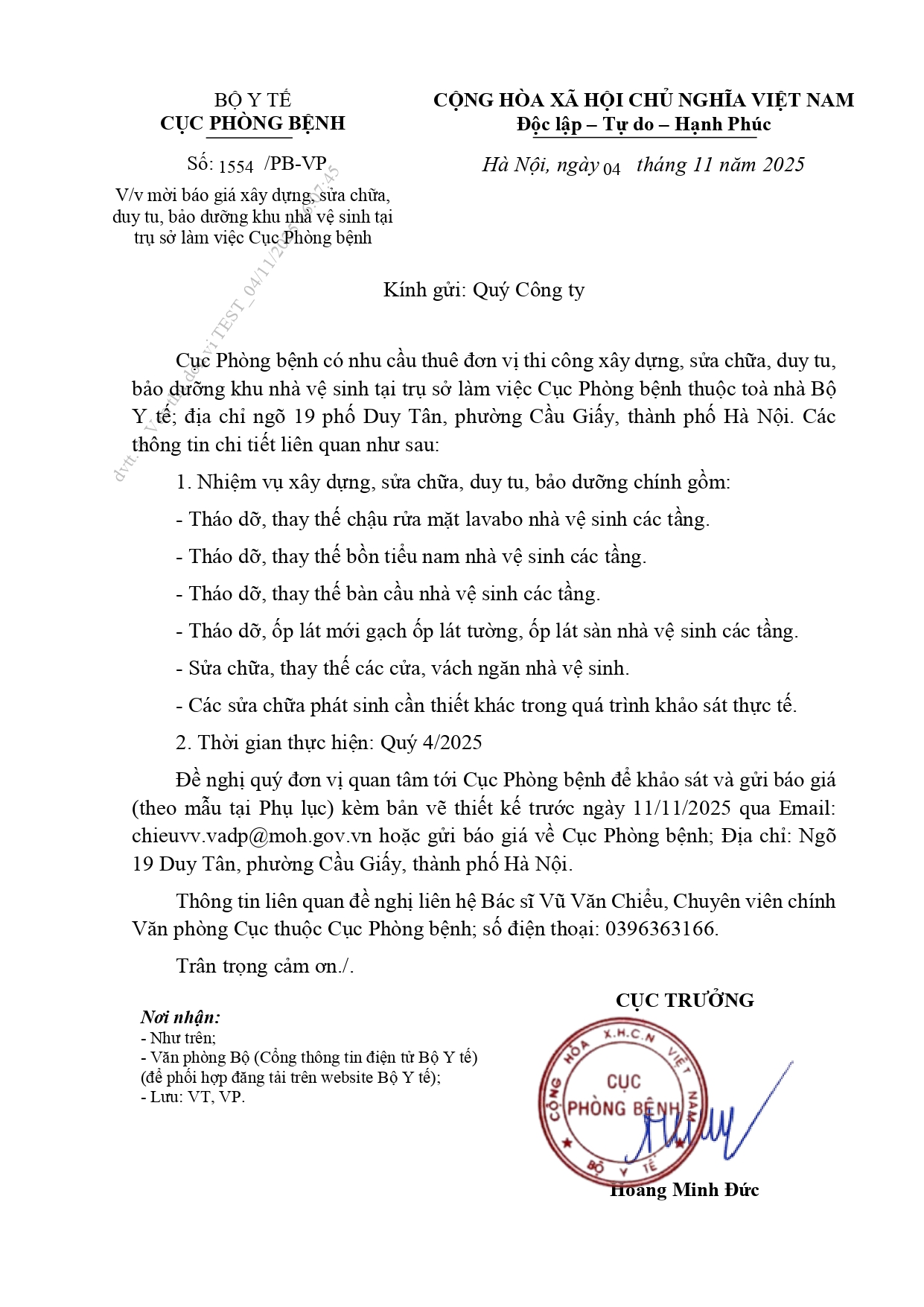 Cục Phòng bệnh mời báo giá xây dựng, sửa chữa, duy tu, bảo dưỡng khu nhà vệ sinh tại trụ sở làm việc Cục Phòng bệnh