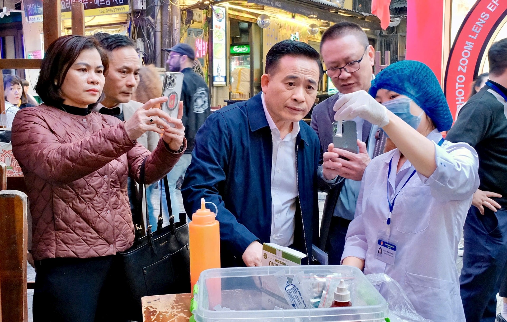 Lấy mẫu kiểm tra nhanh đối với một số chỉ tiêu an toàn thực phẩm. Ảnh: T.A