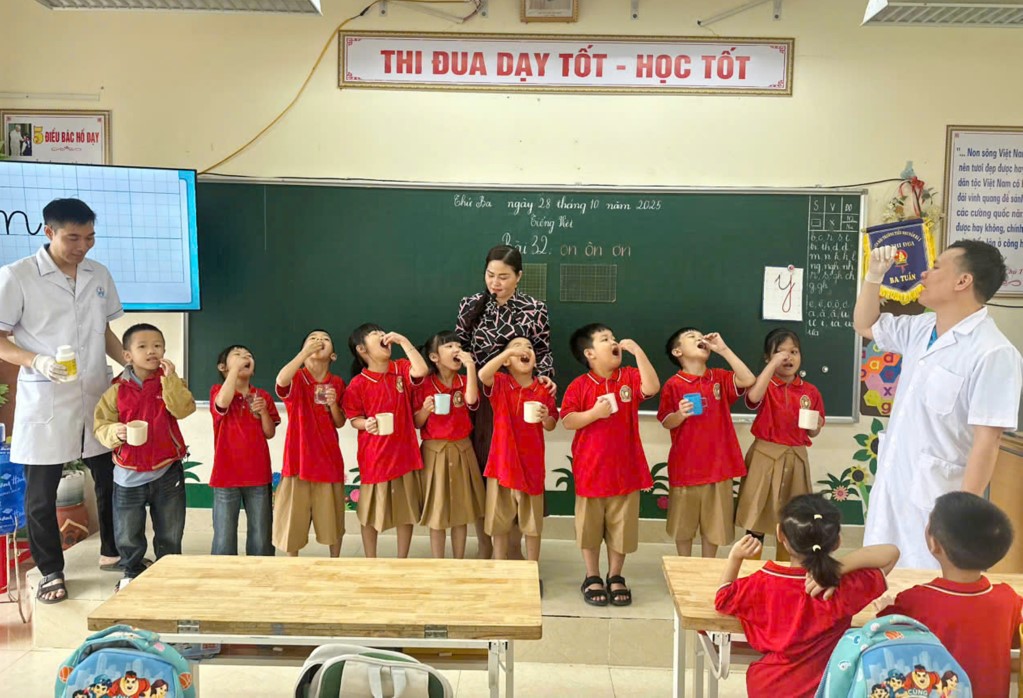 Học sinh Trường Tiểu học Đầm Hà 1 uống thuốc tẩy giun. Ảnh: Quang Hiếu (CDC Quảng Ninh).