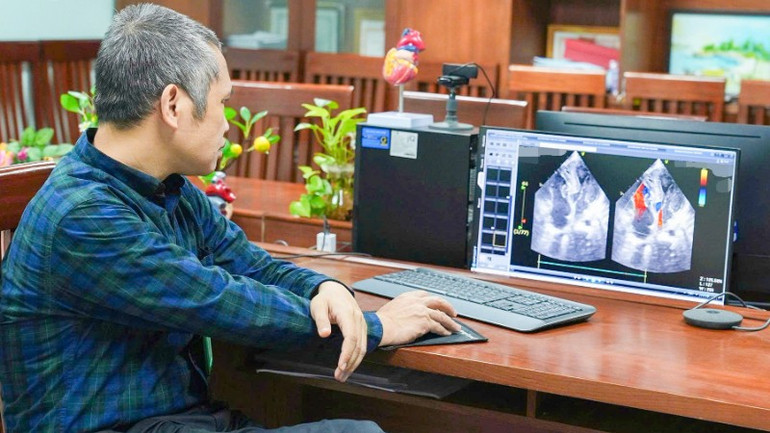 Phó Giáo sư, Tiến sĩ Nguyễn Lý Thịnh Trường phân tích hình ảnh cấu trúc tim của trẻ sau phẫu thuật.