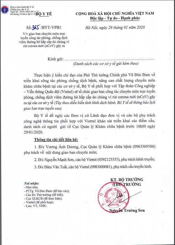 Công văn 365/BYT-VPB1 về việc giao ban chuyên môn trực tuyến công tác phòng, chống dịch viêm đường hô hấp cấp do chủng vi rút corona mới gây ra