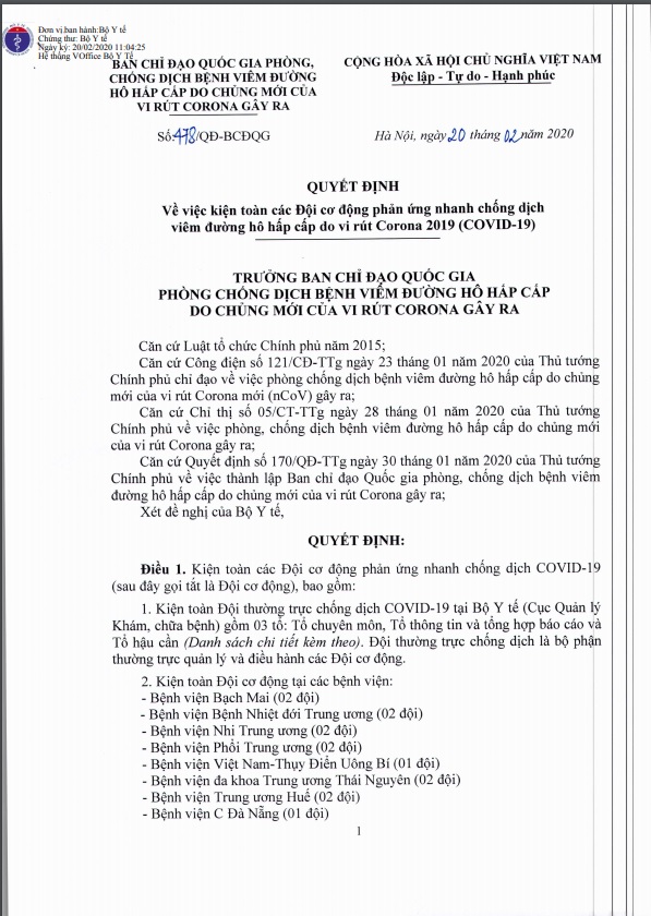 Công văn 478/QĐ-BCĐQG về việc kiện toàn các đội cơ động phản ứng nhanh chống dịch viêm đường hô hấp cấp do virut Corona 2019